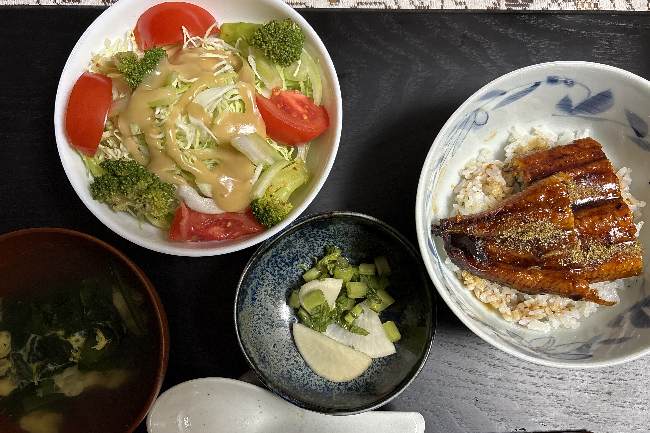 夕食は、鰻丼、野菜サラダ、ほうれん草の玉子とじ汁、大根浅漬け。