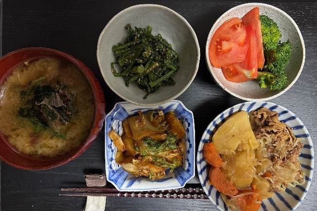 ★ 今日の夕食: ・ お雑煮 ・ 肉じゃが ・ 菊菜の胡麻和え ・ 即席キムチ ・ トマトとブロッコリー